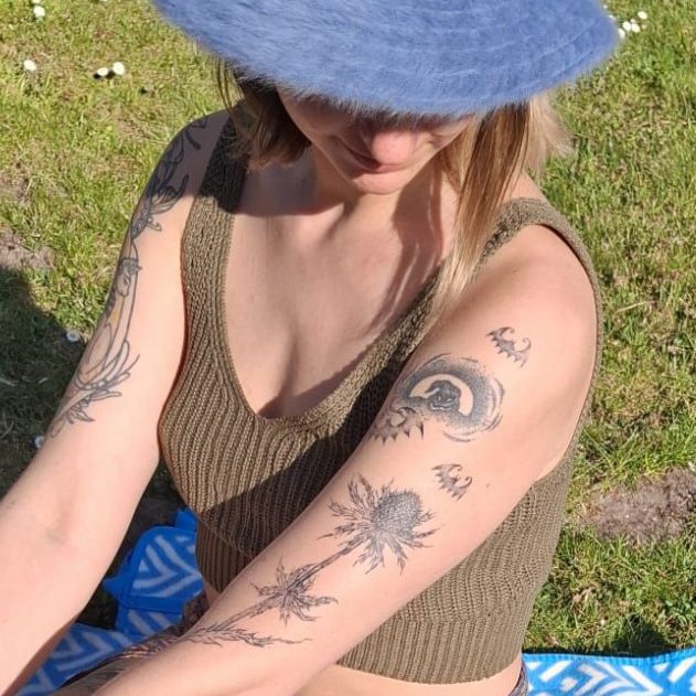Sowie ich mit Handpoke vor etwa 10 Jahren anfing und meine Vorliebe auf Dotwork, Geometrie und Symbolik lag, war das Intresse zu groß um dabei zu bleiben. Inzwischen bin ich Fan des Tattoopens geworden und mag naturelle und auch magische Motive mit Details und Bewegung. Inzwischen verschwimmen die Motive auch viel mit meiner Zirkus Passion, aus der ich viel Inspiration ziehe.